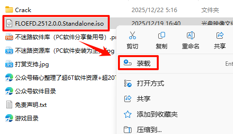 2.打开刚刚解压的文件夹,鼠标右键点击“FLOEFD.2512.0.0.Standalone.iso”文件,选择“装载”(如果没有“装载”选项的可以右键选择“打开方式—Windows资源管理器”打开)