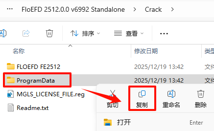 14.返回之前解压的“FloEFD 2512.0.0 v6992 Standalone”文件夹,双击打开“Crack”文件夹,选中“ProgramData”文件夹,鼠标右键选择“复制”