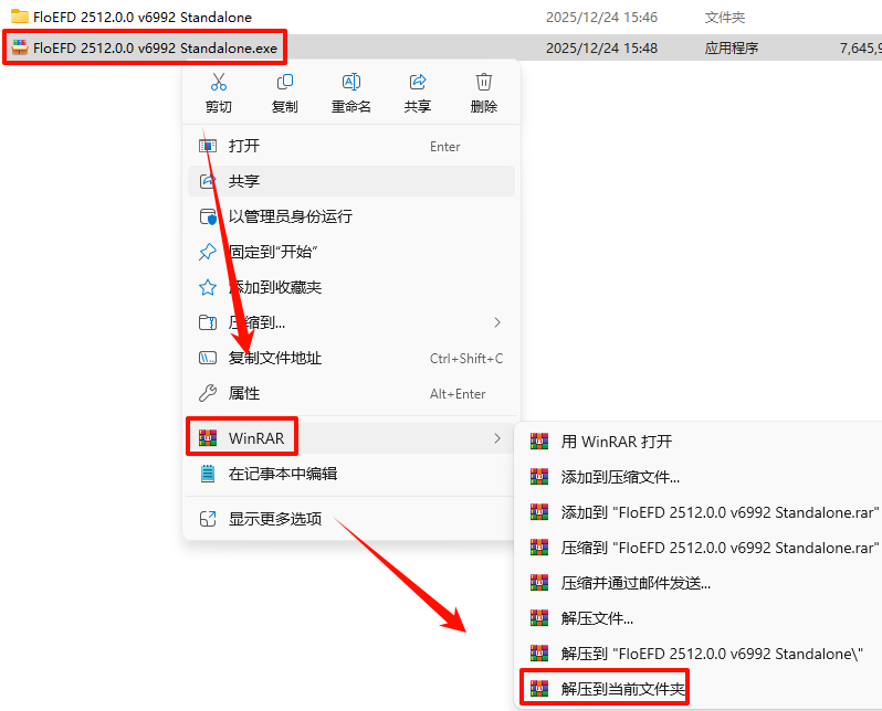 1.选中下载的压缩包,然后鼠标右键选择“解压到当前文件夹”(没有解压选项点这里)