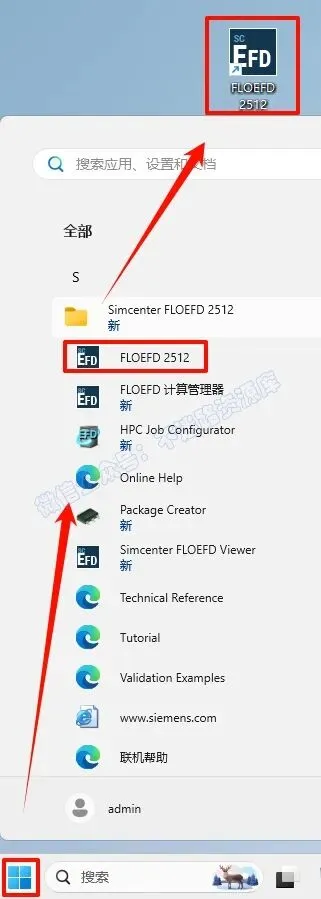 17.点击“开始“菜单栏,点击“所有应用“,找到“FLOEFD 2512“软件,鼠标左键拖拽到桌面上即可创建桌面快捷方式