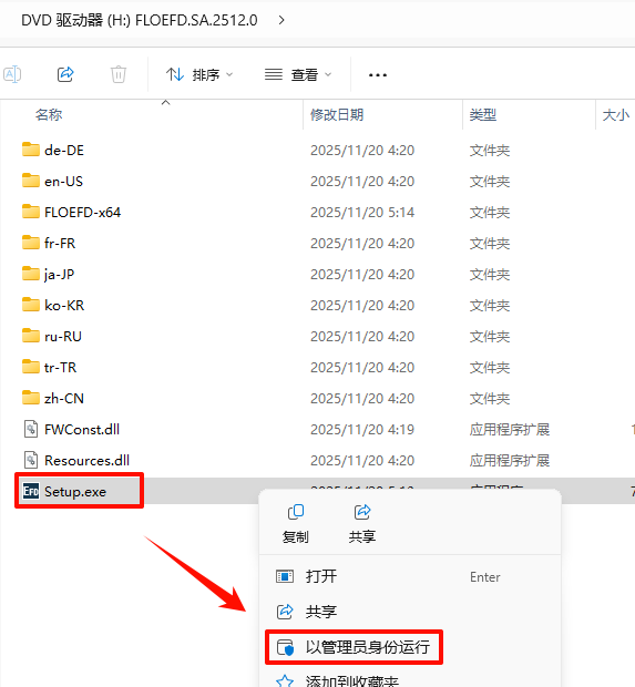 3.鼠标右键点击“Setup.exe”选择“以管理员身份运行”
