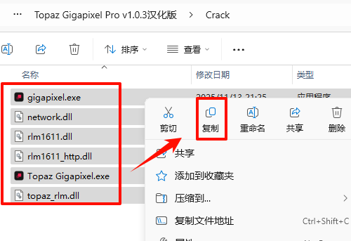 11.返回之前解压的“Topaz Gigapixel Pro 1.0.3汉化版”文件夹,双击打开“Crack”文件夹,选中全部文件,鼠标右键点击“复制”
