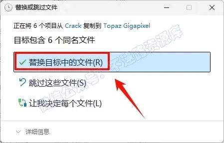14.点击“替换目标中的文件“(若提示需要管理员权限,勾选“为所有...”,点击“继续”)