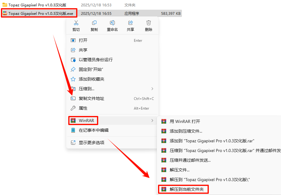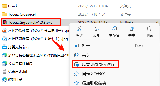 2.打开刚刚解压的文件夹,鼠标右键点击“Topaz.Gigapixel.v1.0.3.exe”选择“以管理员身份运行”