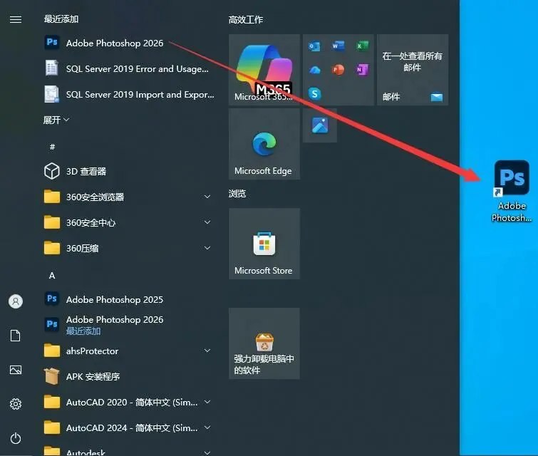 7、点击电脑桌面左下角的开始按钮,找到刚刚安装的Adobe Photoshop 2026软件,鼠标左键按住不放拖拽到电脑桌面。
