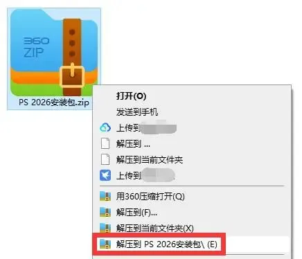 1、得到安装的压缩包之后,鼠标右键解压,点击【解压到PS 2026安装包】。