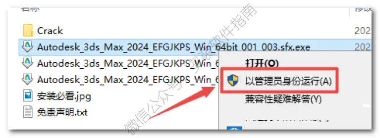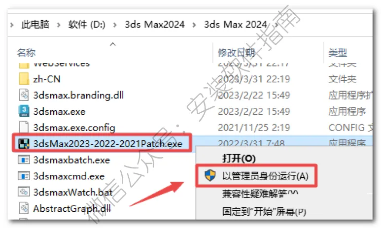 12、找到并选中复制过来的3dsMax2023-2022-2021Patch.exe文件,鼠标右键选择“以管理员身份运行”