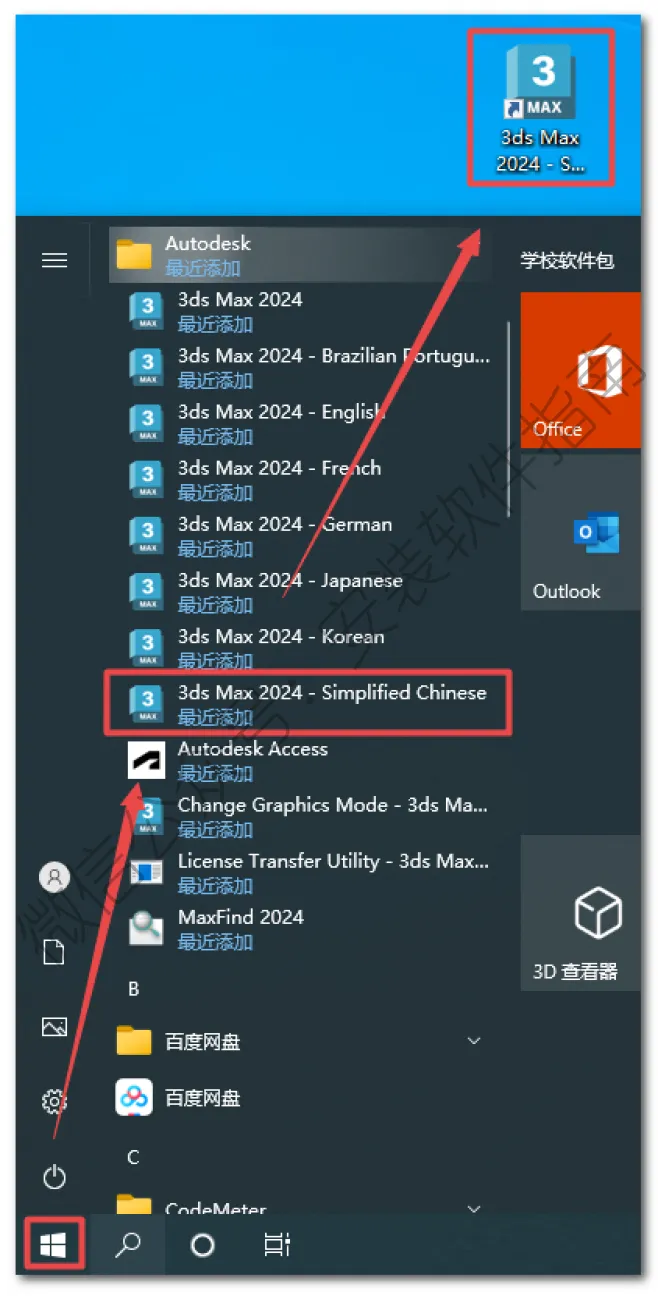 15、点击开始菜单栏,找到“3ds Max 2024 - Simplified Chinese“软件,鼠标左键拖拽到桌面上即可创建桌面快捷方式