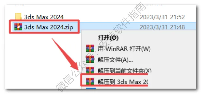 1.选中下载的压缩包,然后鼠标右键选择解压到“3ds Max 2024温馨提示:win11系统需先点击“显示更多选项”