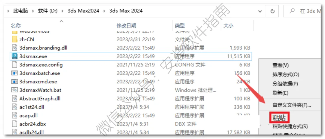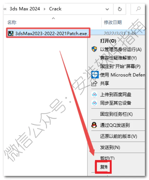 9、返回之前解压的“3ds Max 2024”文件夹,双击打开“Crack”文件夹,找到并选中“3dsMax2023-2022-2021Patch.exe”文件,鼠标右键点击“复制”温馨提示:若打开没有激活工具文件,说明被电脑杀毒软件隔离了,关闭杀毒软件重新解压即可。