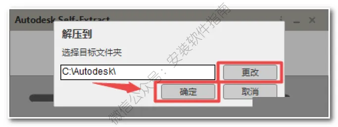 3、选择解压路径,点击“更改”可修改安装包的解压路径注意:目标文件夹的路径中不能有中文,软件安装完成后可删除解压的文件夹,点击“确定”