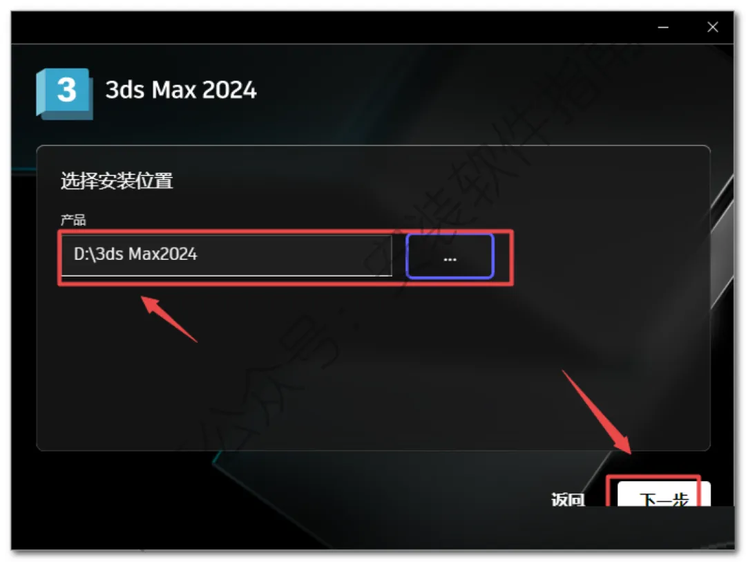 5、点击“...”可以选择软件安装路径,建议和教程中的保持一致,本例安装在D盘(如:将C改为D表示安装到D盘或者可以在其它磁盘里创建一个新的“3ds MaxD2024”文件夹,安装路径不要出现中文点击“下一步”
