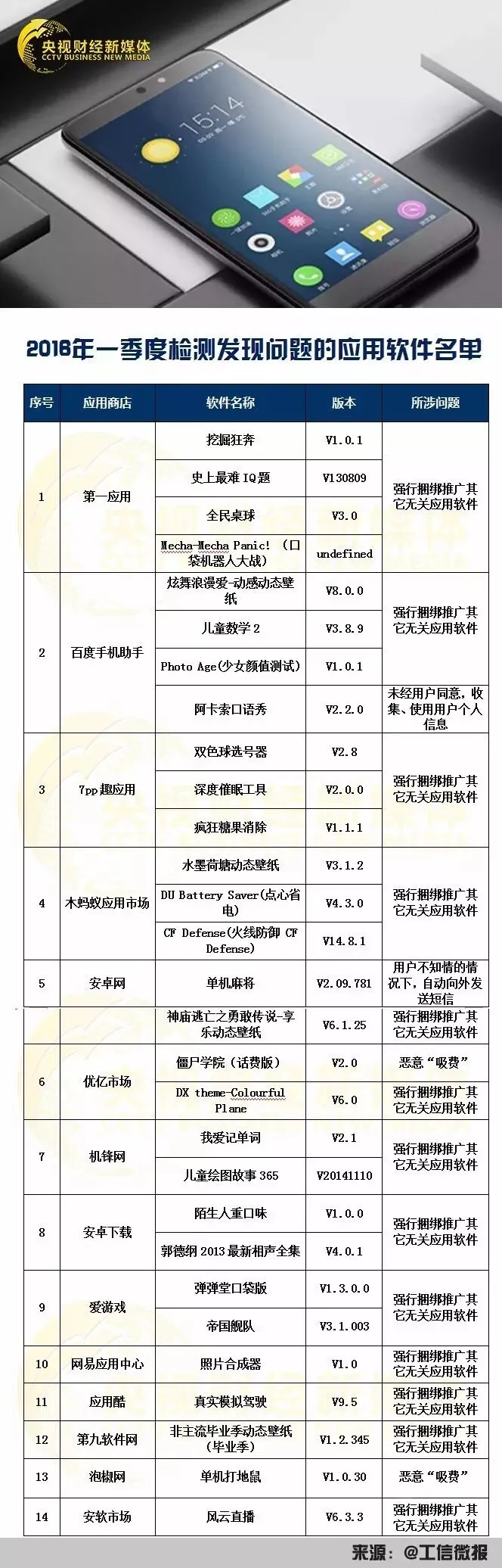 一季度,工业和信息化部组织对43家手机应用商店的应用软件进行技术检测,发现不良软件29款,涉及违规收集使用用户个人信息、恶意“吸费”、强行捆绑推广其他无关应用软件等问题。对三家基础电信企业和91家增值电信企业300项业务进行抽查,发现9项增值业务存在问题,涉及业务内容更新不及时、业务无法使用等。对已开通业务的20家移动转售试点企业网上营业厅进行抽查,发现个别企业存在账单保留期限不规范问题,已督促整改。