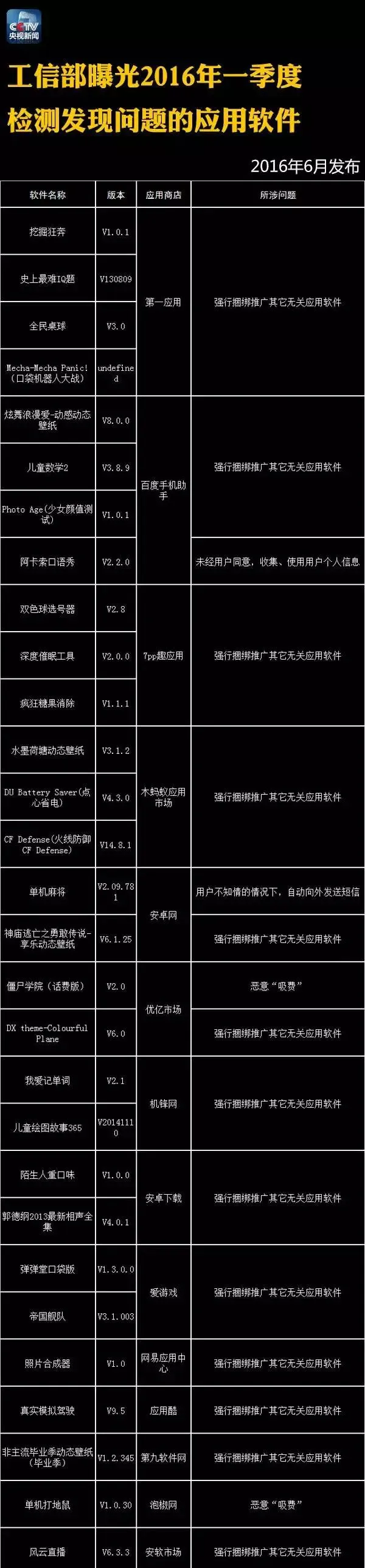 今年三季度,工信部对50家手机应用商店的应用软件进行技术检测,发现违规软件29款,涉及违规收集使用用户个人信息、恶意“吸费”、强行捆绑推广其他无关应用软件等问题。
