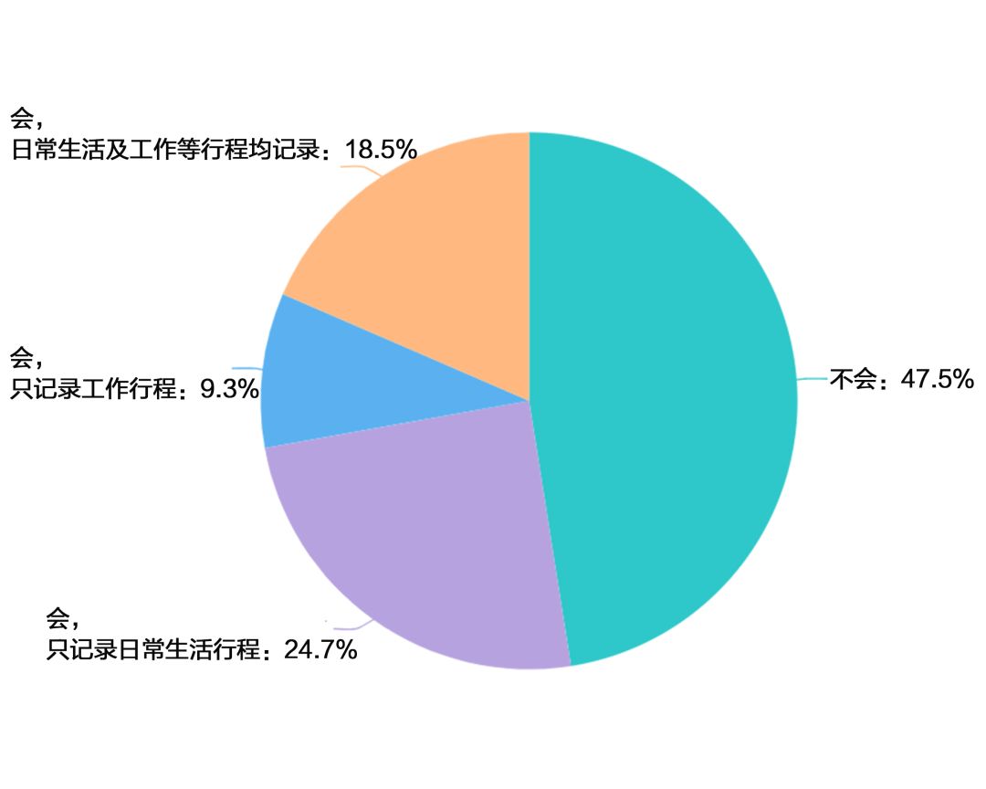用手机日历功能记录行程使用频度高。手机日历具有时间提醒、行程记录等功能。网络调查显示,52.5%的消费者用手机日历功能记录个人行程。其中,24.7%的消费者选择记录日常生活行程;18.5%的消费者记录日常生活及工作等行程。