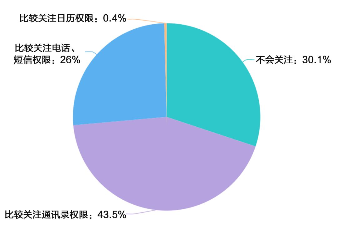 手机APP获取个人权限问题得到关注。网络调查数据显示,69.9%的消费者关注手机APP获取个人权限问题。其中,通讯录权限最为关注,占43.5%;26%的消费者关注电话、短信权限。值得关注的是,仅有0.4%的消费者关注日历权限。