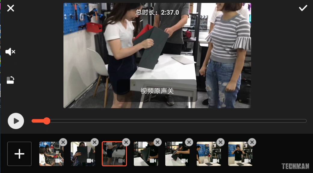 选好音乐之后就正式进入剪辑操作,这部分很简单,我们根据相应的音乐节奏来卡点剪辑即可,这个过程需要反复微调,所以要有点耐心。通过刚才预览音乐,大概可以感觉到,每一段在节奏在 3 秒左右,裁切好片段以后回去预览一遍,