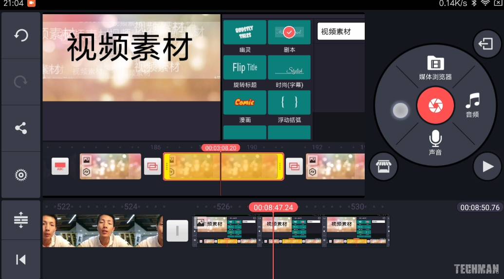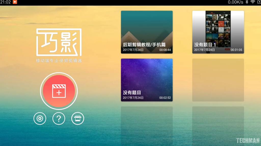 启动软件之后,首页就可以看到项目管理界面,新建和设置选项。我们直接打开一个工程看一下里面的界面,左边一个很大区域的预览窗口可以实时查看效果,通过右边的几个按钮可以导入素材和音乐,底部就是时间线和轨道管理,可以进行多层叠加,这一点不是所有软件都有的,用起来非常方便。手机屏幕比较小,可以点击轨道放大按钮展开操作,这样会更方便。双手捏合还可以缩放整个时间线,这些操作真的可以堪比桌面级剪辑软件了。