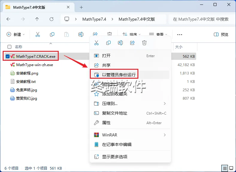8.返回安装包;右键【MathType7.CRACK.exe】选择【以管理员身份运行】