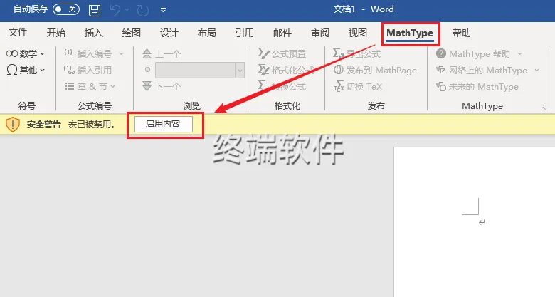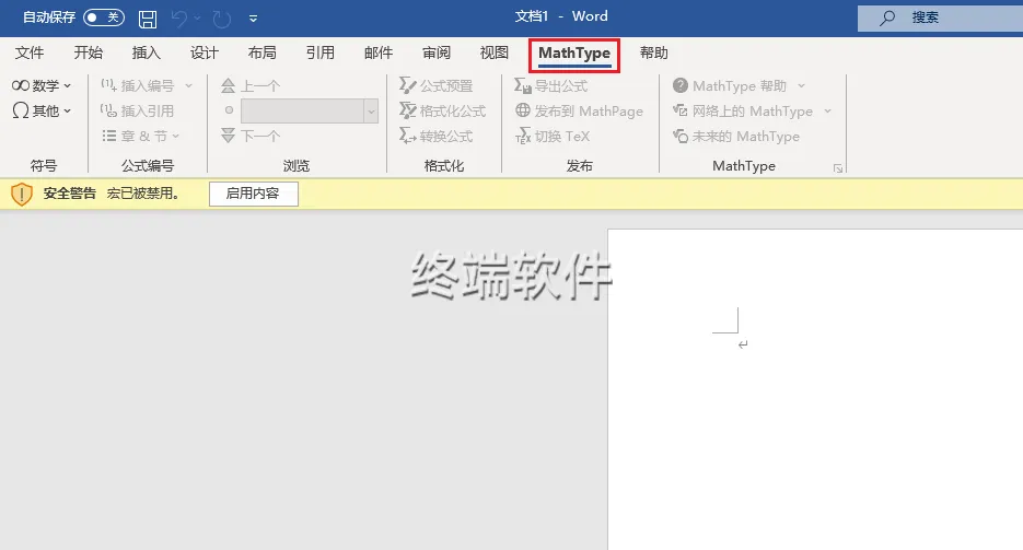 1.打开【Word】软件:发现【MathType】页是灰色的不能用,两种解决方法如下