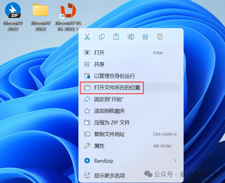 14、回到桌面,右键桌面上的【RizomUV VS RS 2022.1软件图标】,点击【打开文件所在的位置】