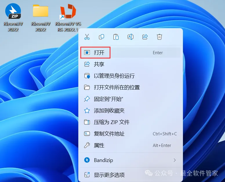 17、回到桌面,右键桌面上的【RizomUV VS RS 2022.1软件图标】,点击【打开】