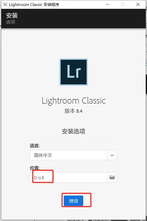 4.点击【文件夹图标】→点击【更改位置】可更改安装位置(建议不要安装在C盘,可以在D盘或其它磁盘下新建一个“lr”文件夹);点击【继续】