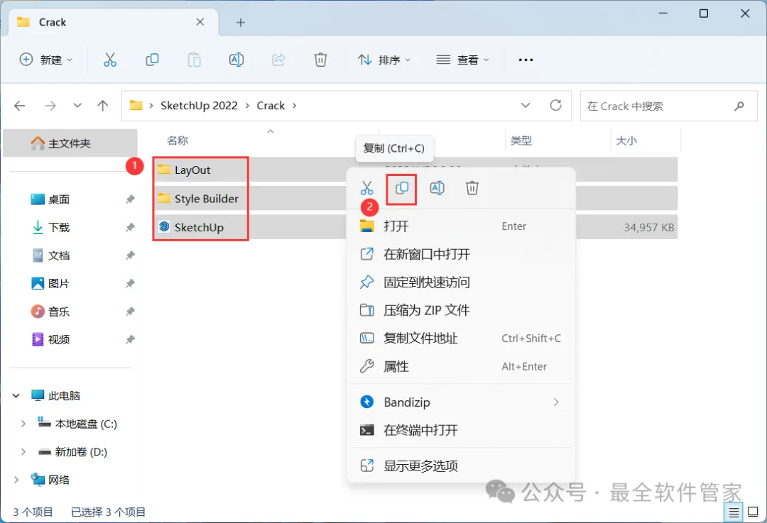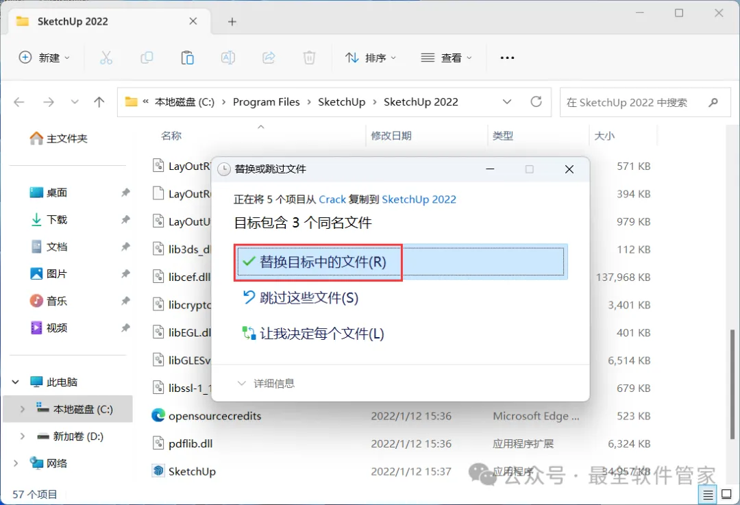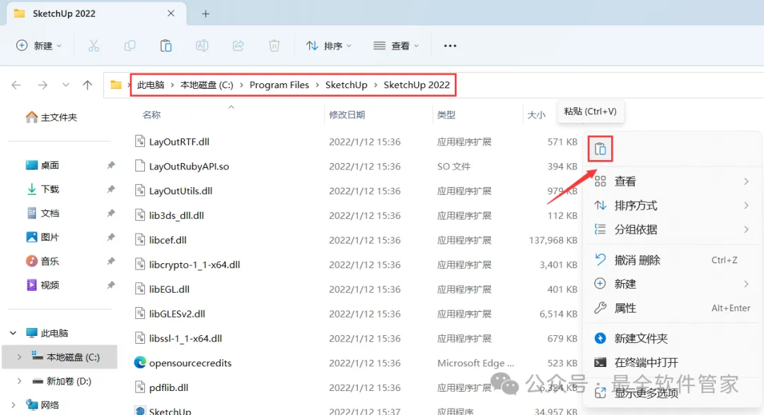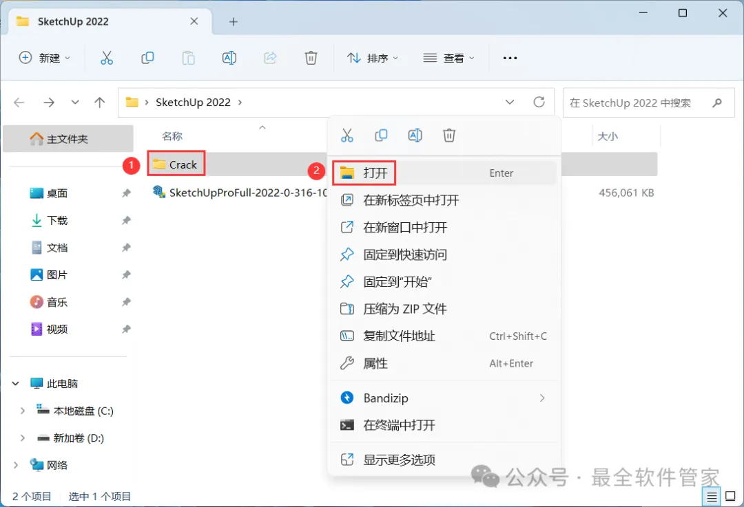 7、回到SketchUp 2022文件夹,找到【Crack】文件夹,右键【打开】它