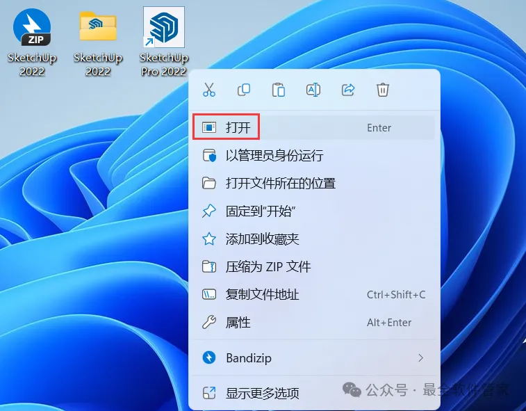 13、回到桌面,右键桌面上的【SketchUp 2022软件图标】,点击【打开】