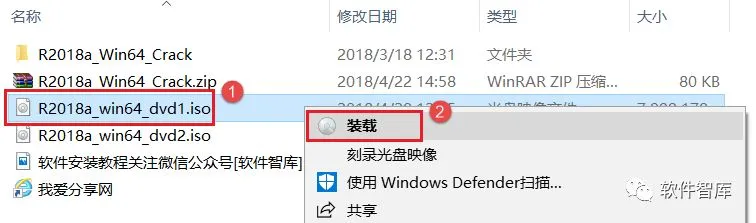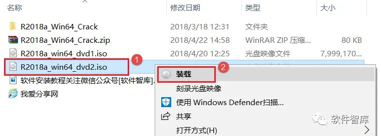 14.返回初始软件安装包,然后找到R2018a_win64_dvd2.iso,鼠标右击选择【装载】