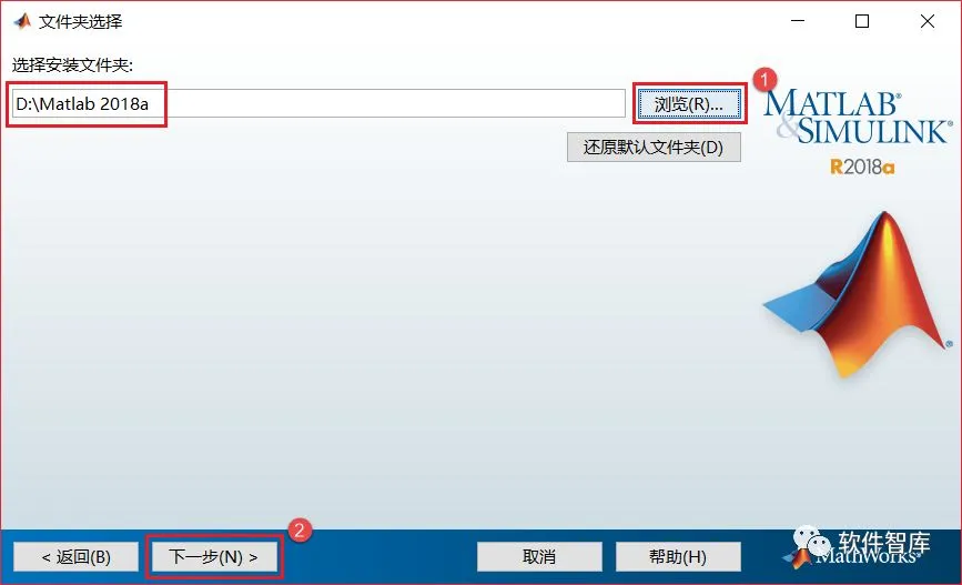7.选择安装文件夹,默认安装在C盘,因软件占用磁盘空间12G+,建议点击【浏览】更改软件安装位置,注意:安装路径文件夹名称均不能出现中文字符!如小编这里将软件安装在D盘Matlab 2018a文件夹下,设置好后点击【下一步】