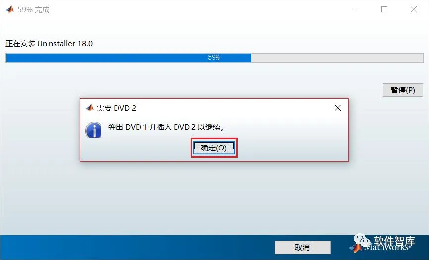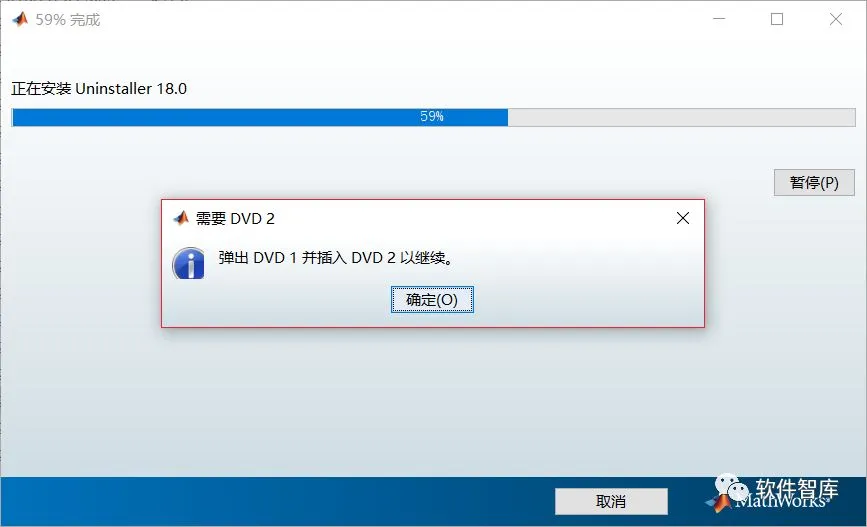 12.安装进度条达59%时,弹出窗口提示:弹出DVD1并插入DVD2以继续,不要着急点击“确定”,因为即使点击也没反应哦,也不要关闭,先把它放在一边