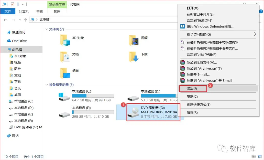 13.下面开始装载第二个.iso文件,在装载新的.iso文件一定要先弹出之前加载的.iso文件,否则无法继续安装,双击桌面“此电脑”图标进入文件资源管理界面,找到之前加载的虚拟光驱,鼠标右击选择【弹出】