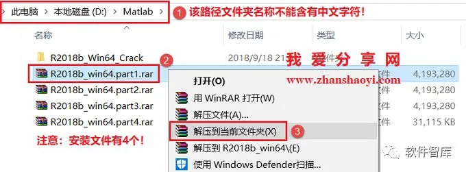 1.先使用“百度网盘客户端”下载Matlab 2018b软件安装包(有4个)和Crack破解补丁到电脑磁盘里根目录或全英文路径的文件夹下,如小编这里下载到D盘Matlab文件夹里,然后找到R2018b_win64.part1.rar,鼠标右击选择【解压到当前文件夹】