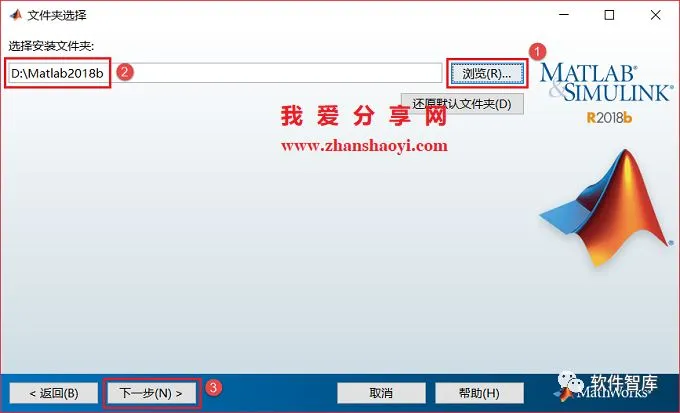 7.选择软件安装路径,默认安装在C盘,因软件占用磁盘空间10G+,建议点击【浏览】更改软件安装位置,注意:安装路径文件夹名称均不能含有中文字符!如小编这里将软件安装在D盘Matlab2018b文件夹下,设置好后点击【下一步】
