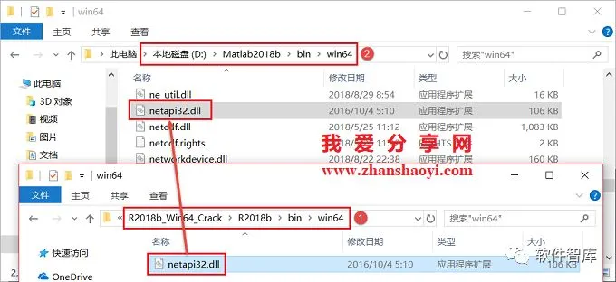 15.打开R2018b_Win64_Crack文件内的R2018b\bin\win64文件夹,将文件夹里面的netapi32.dll文件复制并粘贴到安装目录中win64文件夹下,例如小编的安装目录是D:\Matlab2018b,所以粘贴到D:\Matlab2018b\bin\win64文件夹下