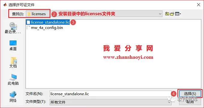 19.点击【浏览】,在弹出的窗口中先将“查找”栏设置为软件安装目录中licenses文件夹,然后找到license_standalone.lic,单击选中它,点击【选择】,再点击【下一步】
