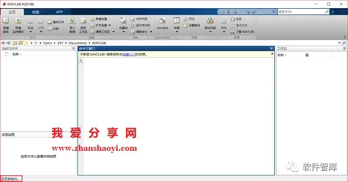 23.打开Matlab 2018b软件,界面如下,第一次打开,左下角会提示“正在初始化…”,这个过程大概需要2-3分钟左右的时间
