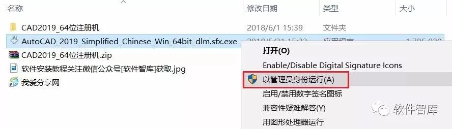 1.根据自己电脑操作系统位数使用“百度网盘客户端”下载AutoCAD 2019软件安装包(含注册机)到电脑磁盘里,并解压缩,安装前先断开电脑网络,然后找到AutoCAD_2019_Simplified_Chinese_Win_64bit_dlm.sfx.exe,鼠标右击选择【以管理员身份运行】