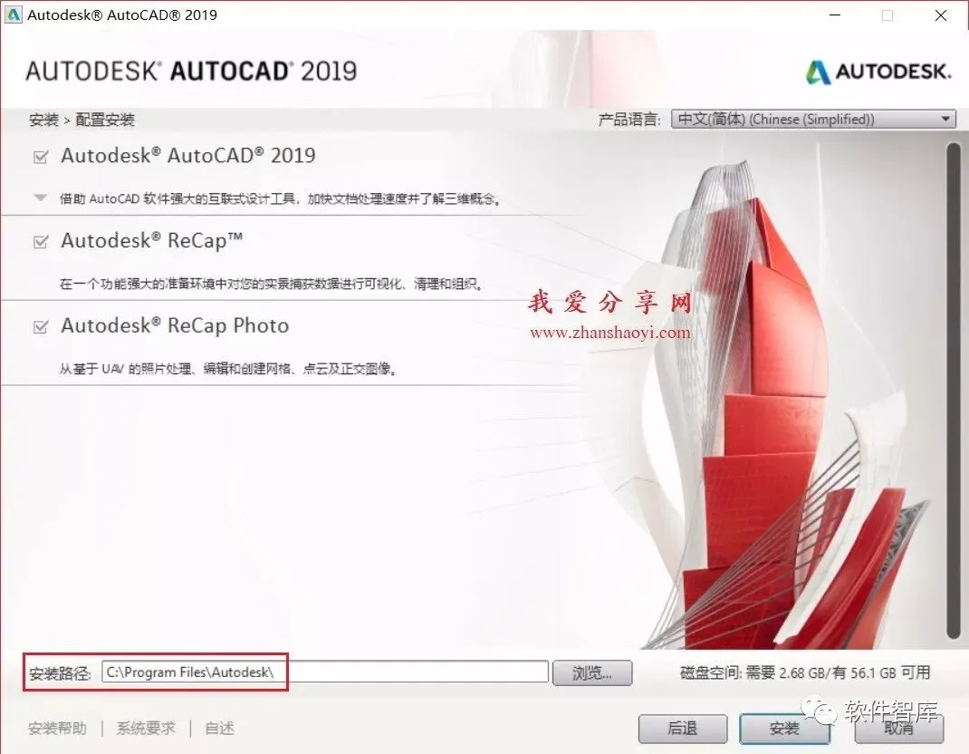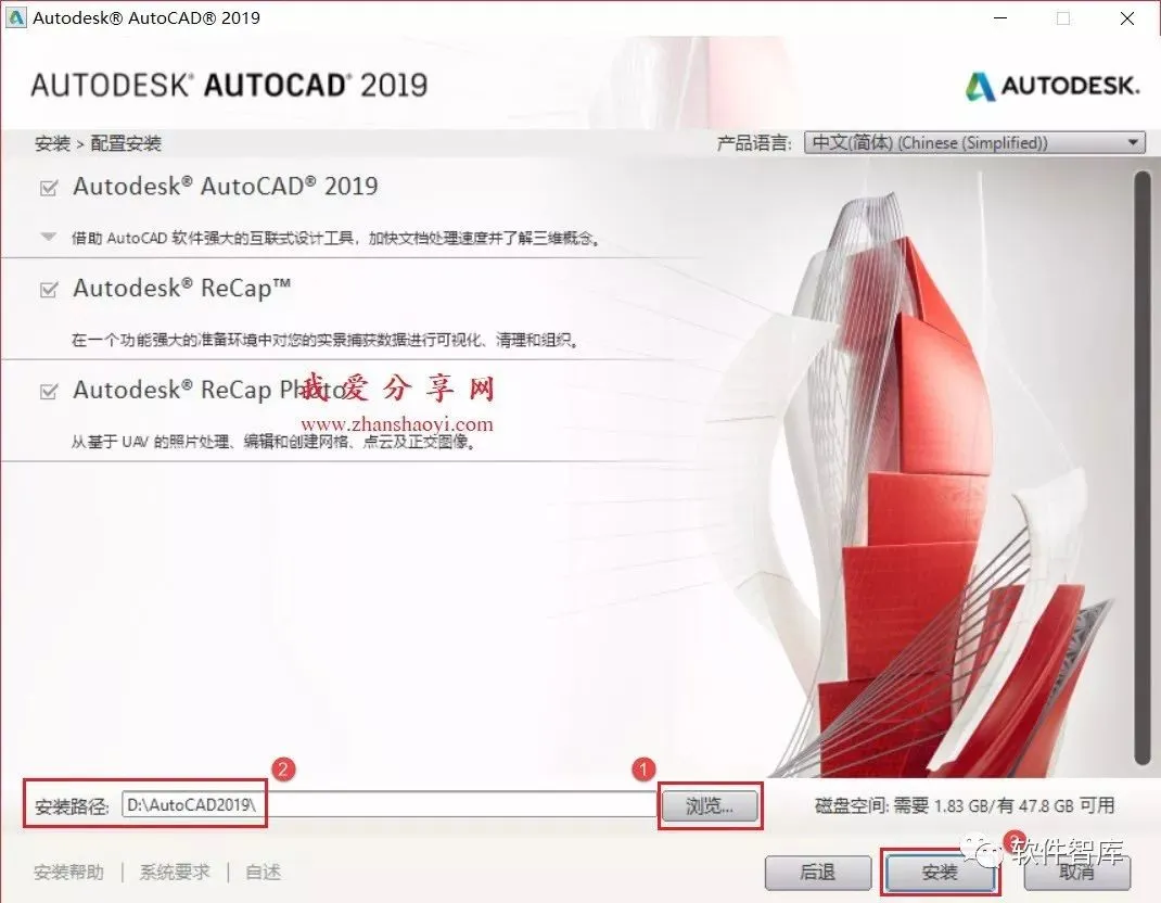 7.选择软件安装路径,默认安装在C盘,点击【浏览】可更改软件安装路径,注意:安装路径文件夹名称不能出现中文字符!小编这里将安装在D盘AutoCAD2019文件夹下,然后点击【安装】