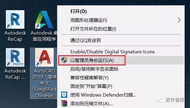 11.返回电脑桌面,找到AutoCAD 2019软件图标,鼠标右击选择【以管理员身份运行】