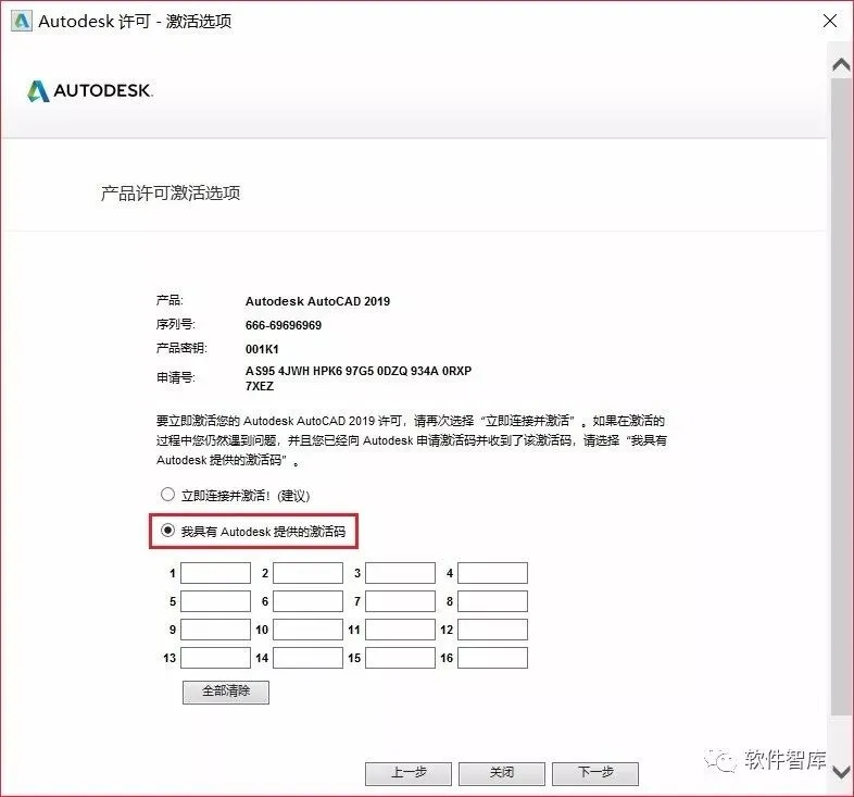 20.首先勾选“我具有Autodesk提供的激活码”,不用着急点击“下一步”,下面我们通过注册机来生成激活码