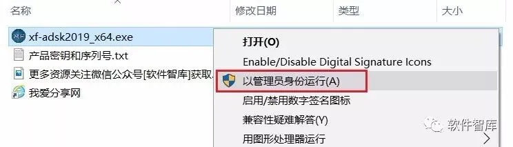 21.返回初始安装包,双击打开CAD_2019_64位注册机文件夹,然后找到xf-adsk2019_x64.exe,鼠标右击选择【以管理员身份运行】,注意:一定要“以管理员身份运行”注册机,不然会激活失败