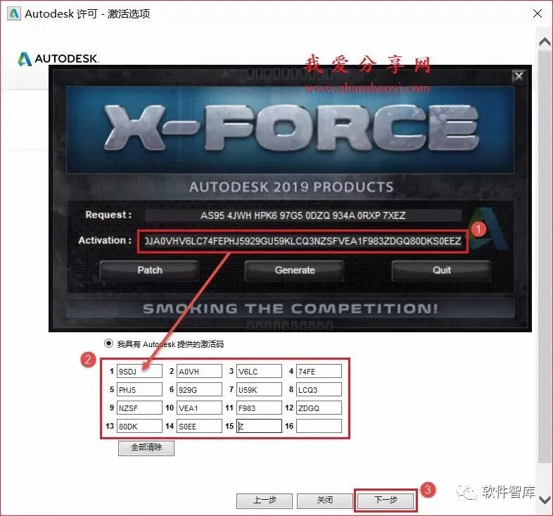 24.再将注册机界面中“Activation”栏后面框中生成的激活码复制粘贴到安装界面中的第一个小框中即可自动填充,然后点击【下一步】