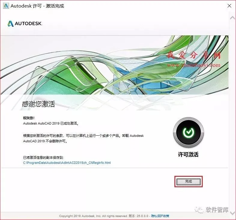 25.提示AutoCAD 2019激活成功,然后点击【Quit】关闭注册机,再点击【完成】