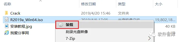 2、安装前先断开电脑网络,然后找到R2019a_Win64.iso,鼠标右击选择【装载】