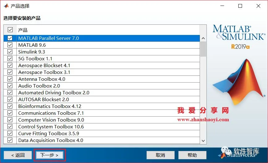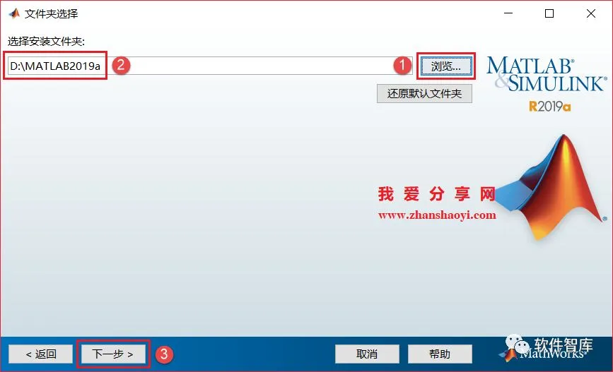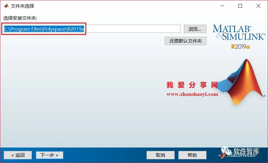9、选择软件安装路径,默认安装在C盘,因软件占用磁盘空间19G+,建议点击【浏览】更改软件安装位置,注意:安装路径文件夹名称均不能含有中文字符!小编这里将软件安装在D盘MATLAB2019a文件夹下,设置好后点击【下一步】