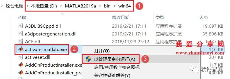 19、打开软件安装目录中的win64文件夹,D:\Matlab2019a\bin\win64文件夹,找到activate_matlab.exe,鼠标右击选择【以管理员身份运行】