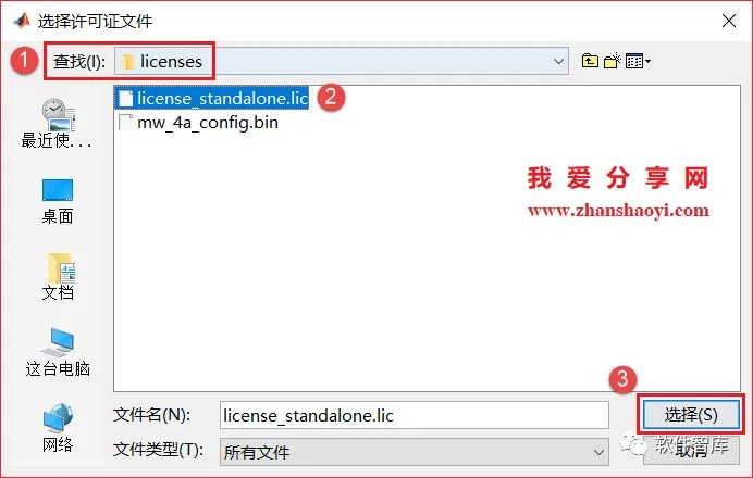 22、依次打开D:\MATLAB2019a\licenses文件夹,然后找到license_standalone.lic文件,单击选中它后点击【选择】按钮