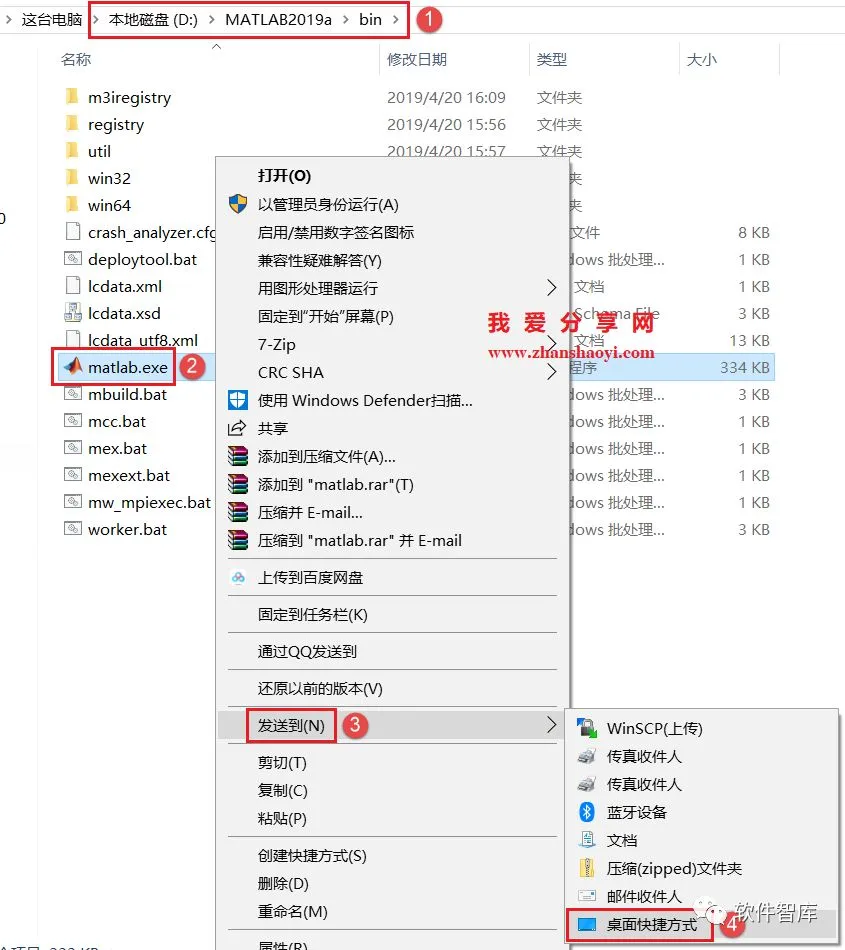 25、WIN10系统中不自动生成桌面图标,返回软件安装目录文件夹,如D:\MATLAB2019a,找到matalb.exe,鼠标右击选择【发送到】→【桌面快捷方式】,生成桌面图标,方便以后打开软件